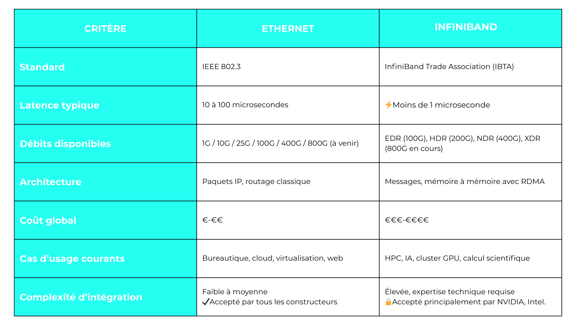 Ethernet reste le pilier des réseaux traditionnels grâce à sa souplesse, sa large compatibilité et ses coûts abordables. En parallèle, InfiniBand poursuit sa conquête des environnements ultra-performants où chaque microseconde d’optimisation permet de gagner en calcul, en modélisation ou en puissance IA.