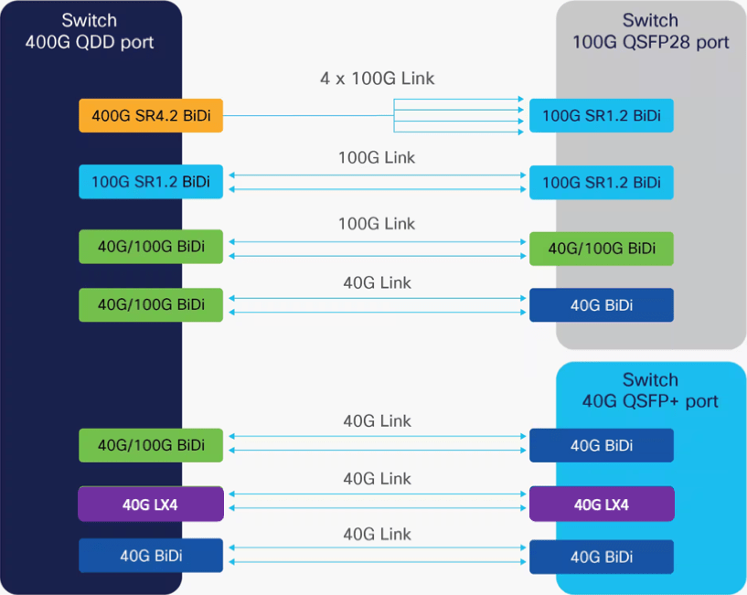 Pureoptics ne propose pas l’équivalent du QSFP-40/100-SRBD qui permet d’atteindre 70M sur de la fibre multi-mode OM3 et 100m sur de la fibre OM4. L’alternative est le QSFP-100G-SR1.2-PO qui permet d’atteindre 70M sur de la fibre multi-mode OM3 et 100m sur de la fibre OM4. Il est également compatible avec le futur QSFP-DD-400G-SR4.2-PO.